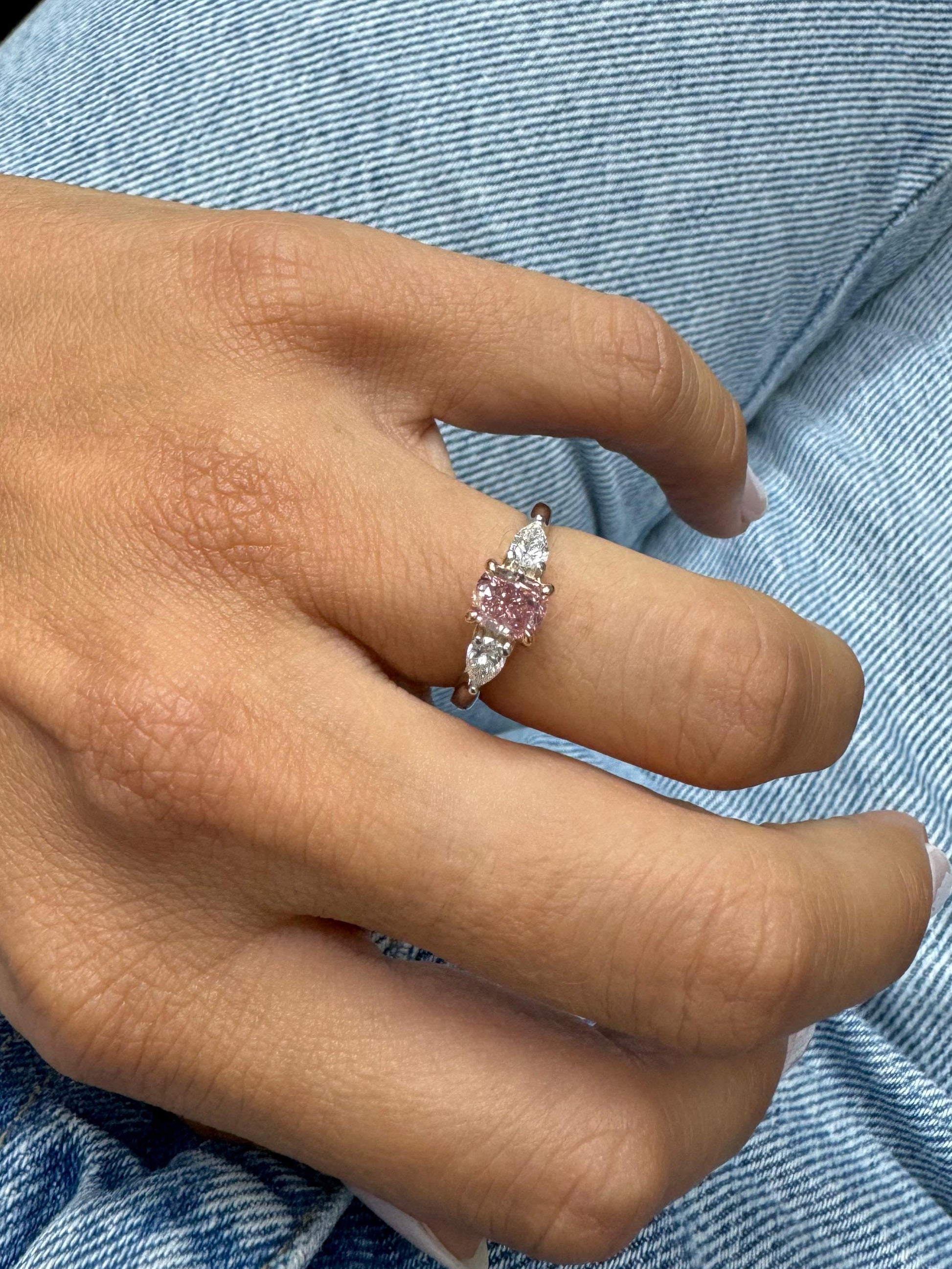 Original creation: 1.00ct fancy pink cushion from South Africa, beautiful enhanced by colourless pears on each side.